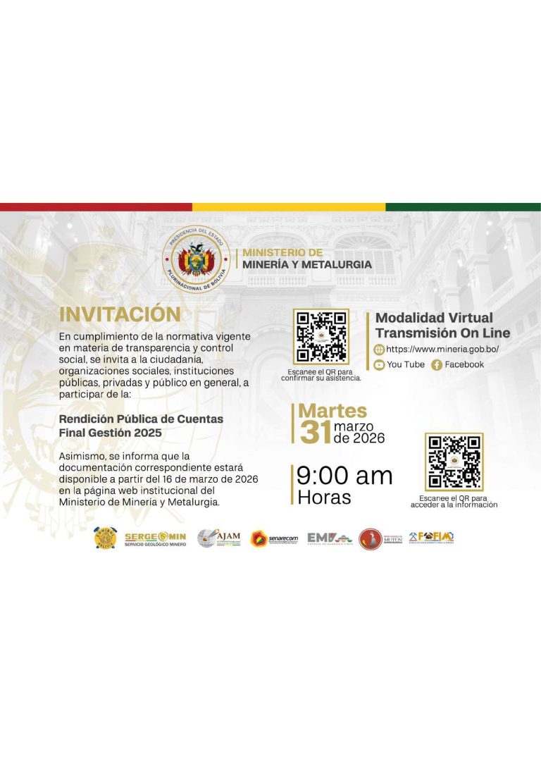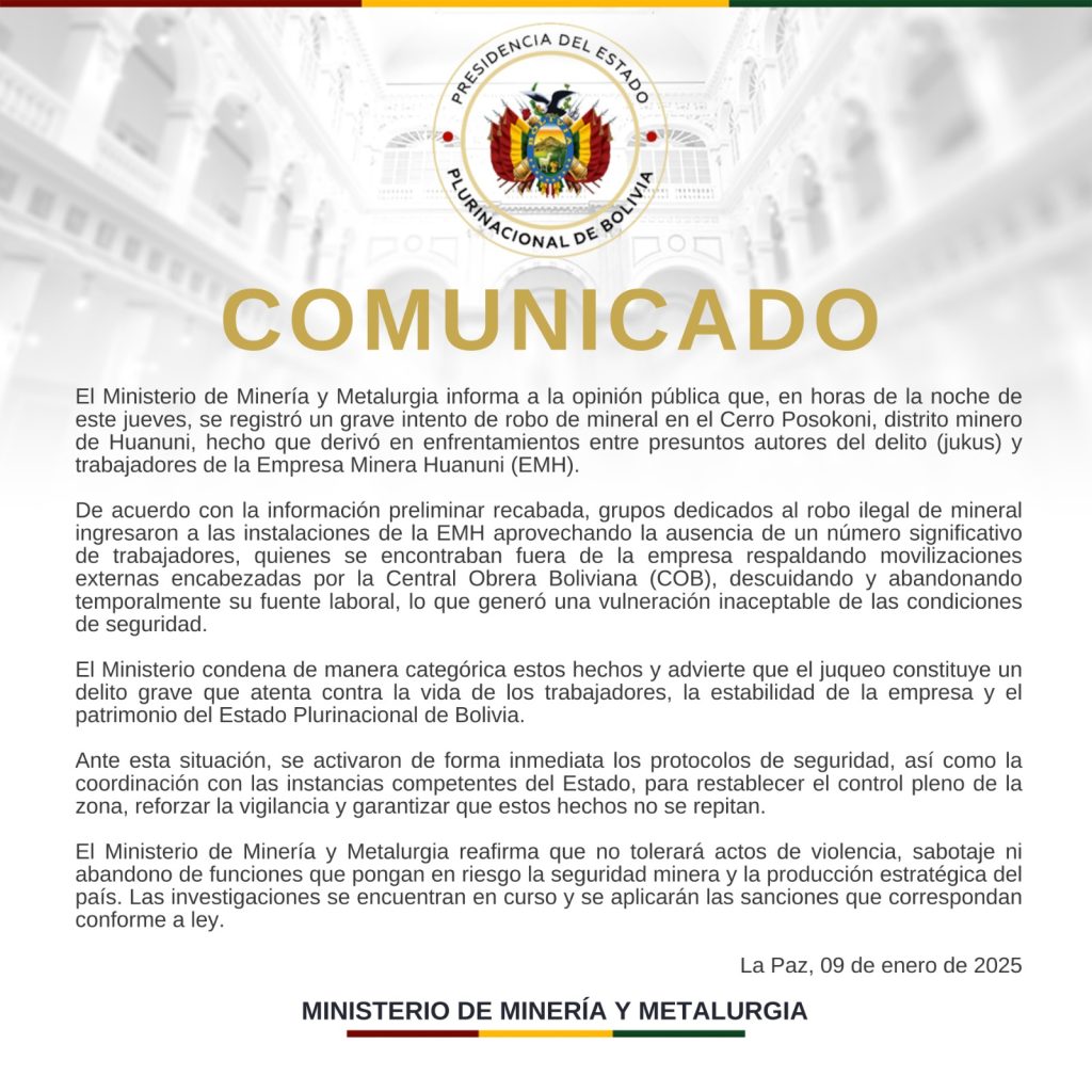 La Paz, 10 de diciembre de 2025 8Unicom – SERGEOMIN).- El Servicio Geológico Minero (SERGEOMIN), bajo tuición del Ministerio de Minería y Metalurgia (MMM), recibió a la Misión del Banco Mundial (BM) para dar inicio al programa “Fortalecimiento del Sector Minero en Bolivia”, una iniciativa estratégica alineada con la visión de modernización institucional impulsada por el Gobierno del presidente Rodrigo Paz Pereira.