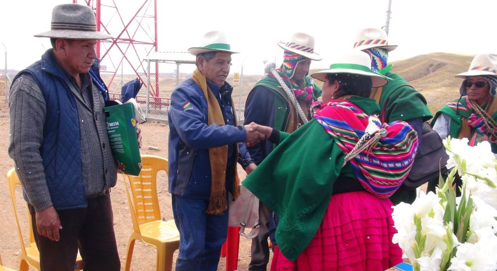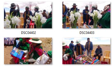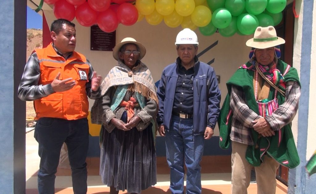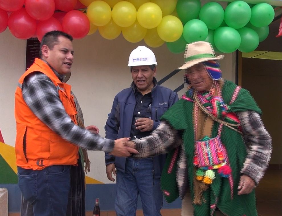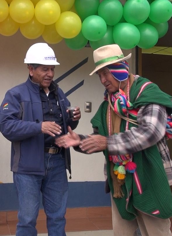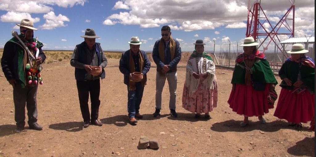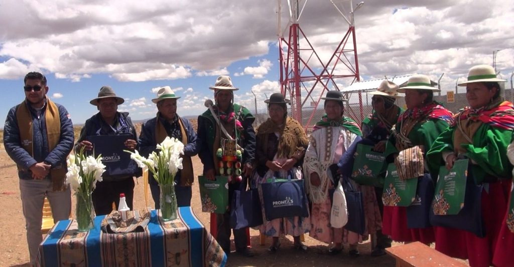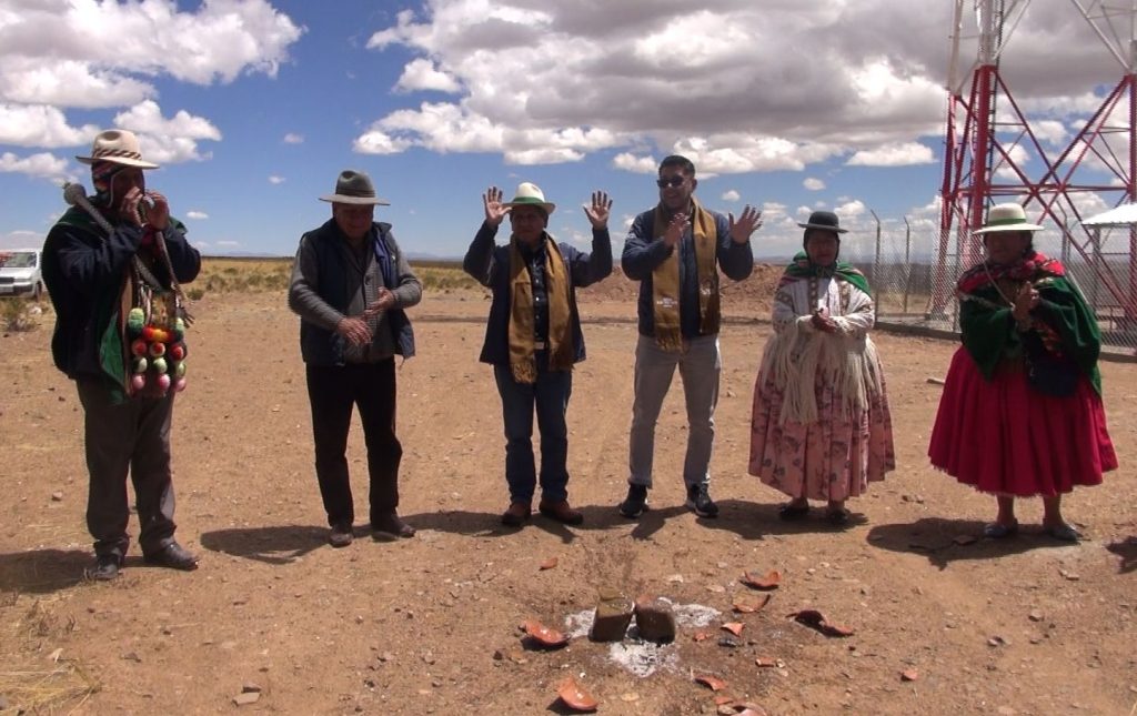 Posteriormente, las autoridades del SERGEOMIN, se trasladaron a la comunidad de Pokevillque para realizar la ch´alla respectiva de la estación de Comunicaciones por Radio Base implementada por el Programa PRONTIS.