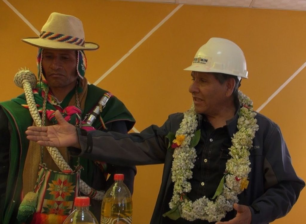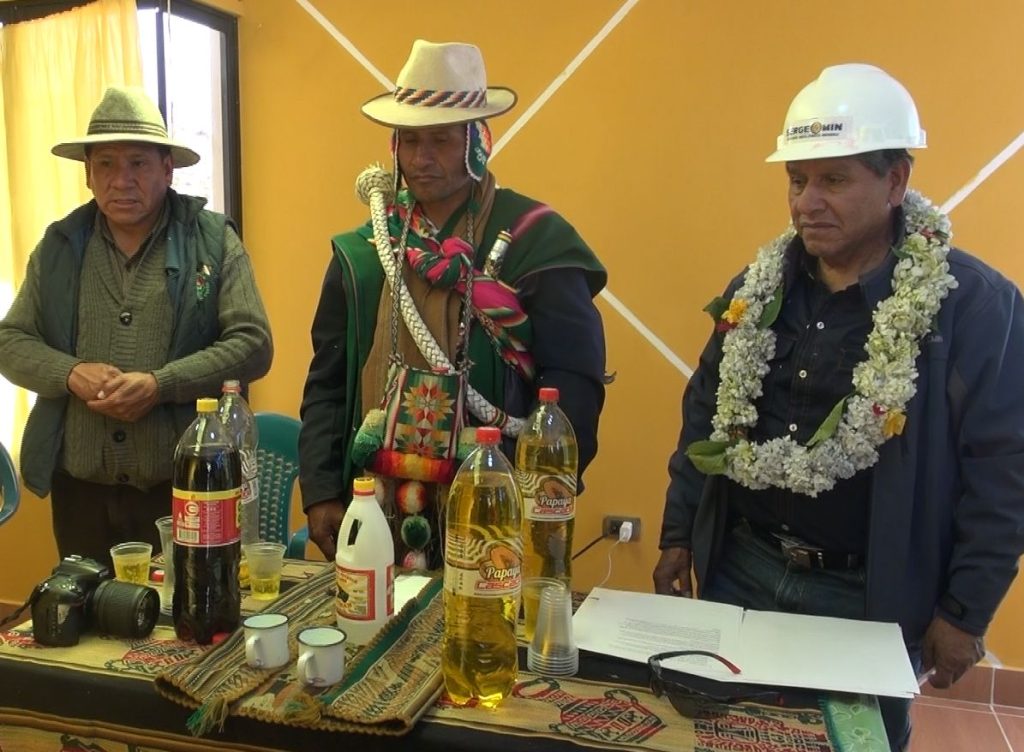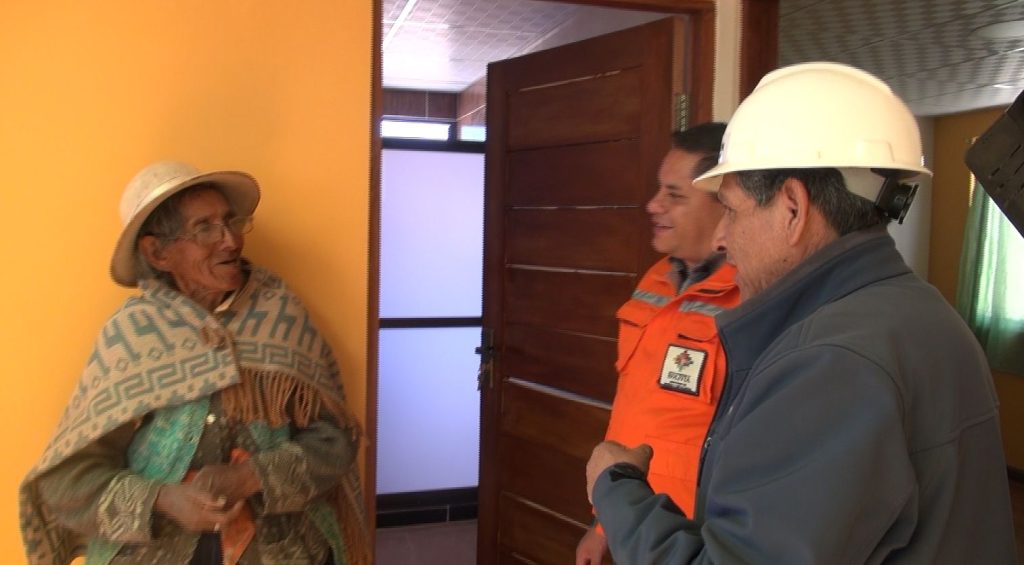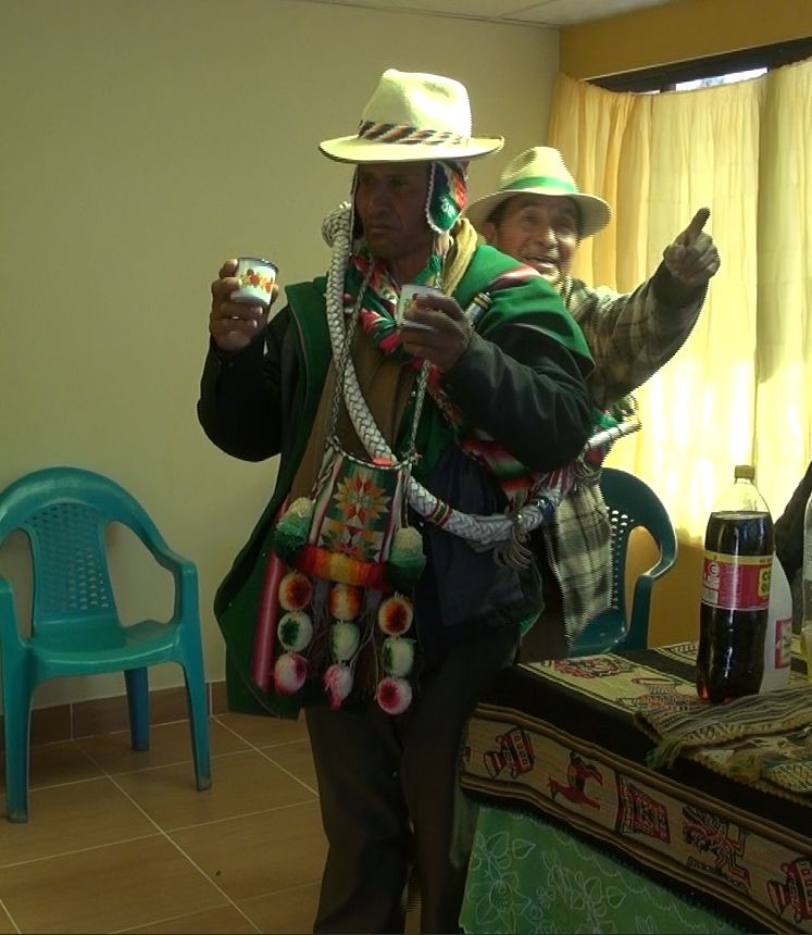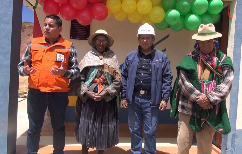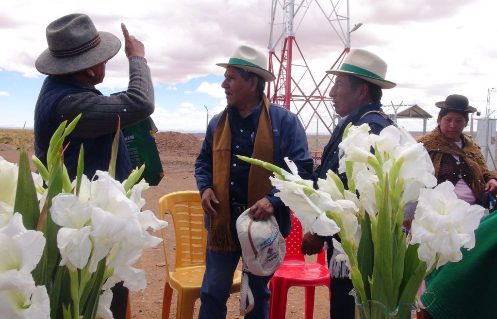 Posteriormente, las autoridades del SERGEOMIN, se trasladaron a la comunidad de Pokevillque para realizar la ch´alla respectiva de la estación de Comunicaciones por Radio Base implementada por el Programa PRONTIS.