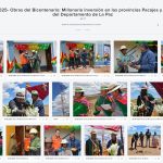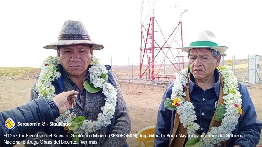 La Paz, 25 de septiembre de 2025 (Unicom – SERGEOMIN).- El Director Ejecutivo Nacional del Servicio Geológico Minero (SERGEOMIN), Ing. Gilberto Borja Navarro, entregó hoy, a nombre del Gobierno Nacional,  “Obras del Bicentenario” en la provincia Pacajes del departamento de La Paz, con una inversión que supera los nueve millones de bolivianos; entre la Construcción del Centro de Salud con Internación en Canuta, la Instalación de Comunicaciones por Radio Base, La Construcción de la Casa Consistorial de Santiago de Callapa y la Construcción de Viviendas bajo la Modalidad de Autoconstrucción.