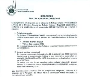 COMUNICADOS DESTACADOS Cronograma de Inspección de Actividades Mineras sergeomin 15 de enero de 2026 Sigue leyendo Anterior Entrada anterior: SERGEOMIN – Visión Deja una respuesta Cancelar la respuestaTu dirección de correo electrónico no será publicada. Los campos obligatorios están marcados con *Comentario * Nombre * Correo electrónico * Web Guarda mi nombre, correo electrónico y web en este navegador para la próxima vez que comente. Δ Publicaciones Relacionadas Comunicado: Feriado 1 y 2 de enero 31 de diciembre de 2025 SERGEOMIN ENTABLA ACERCAMIENTO CON EL BANCO MUNDIAL PARA UN TRABAJO CONJUNTO 10 de diciembre de 2025